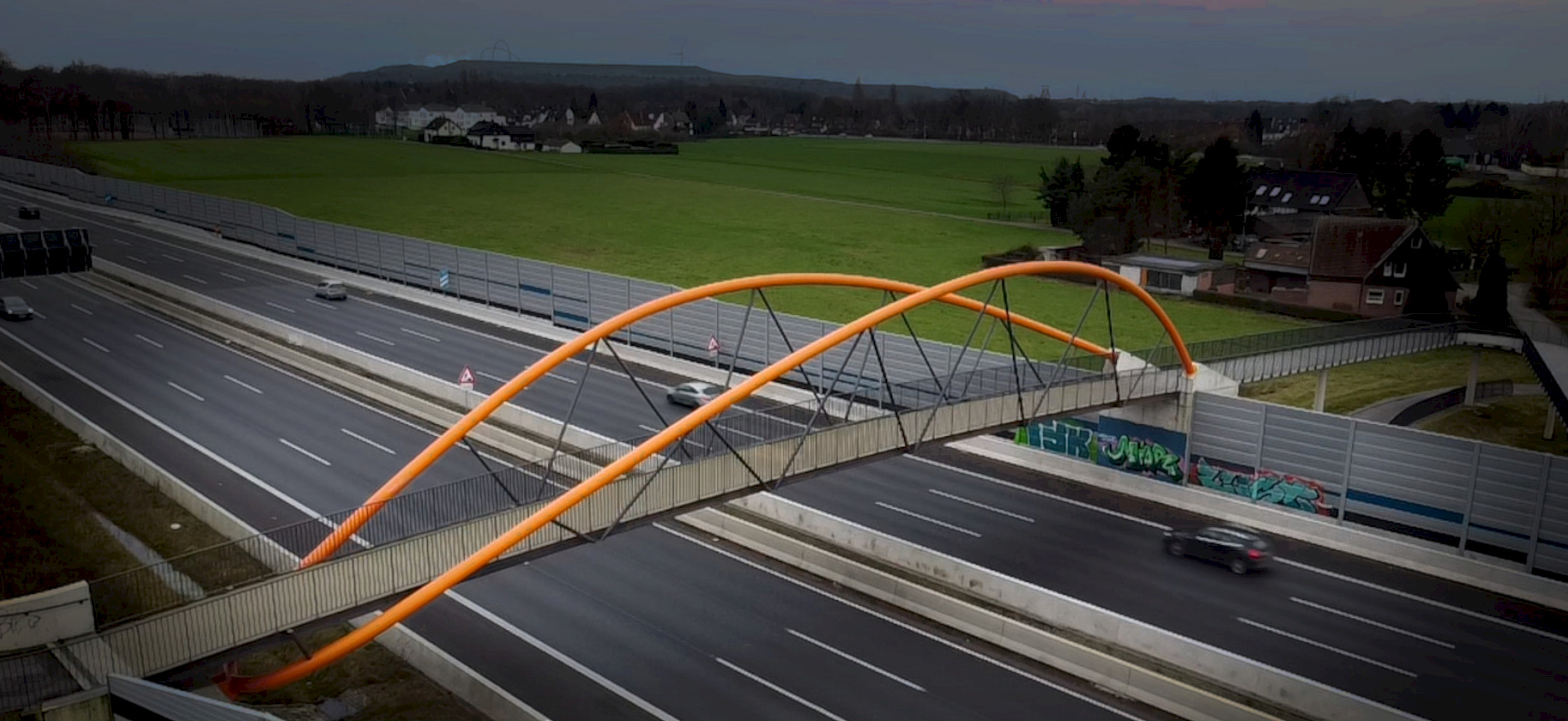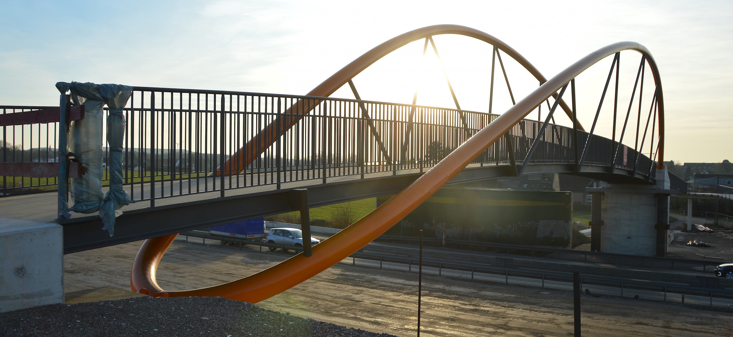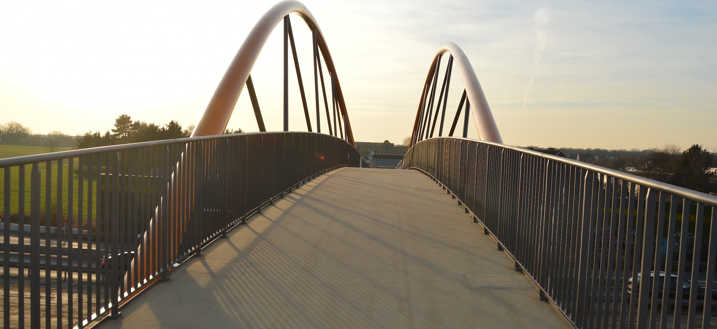 Stahlrohr-Bogenkonstruktion mit diagonalen Hängern und Stahlfahrbahn und anschließender Rampenbrücke aus Stahlbeton. Stützweite der Stahlbrücke: 46,00 m; Gehwegbreite 3,50 m.